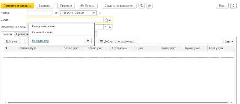 и обязательно должны указать склад по которому мы проводим инвентаризацию