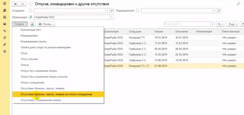 Как зарегистрировать отсутствие нескольких сотрудников в 1С:ЗУП ред.3