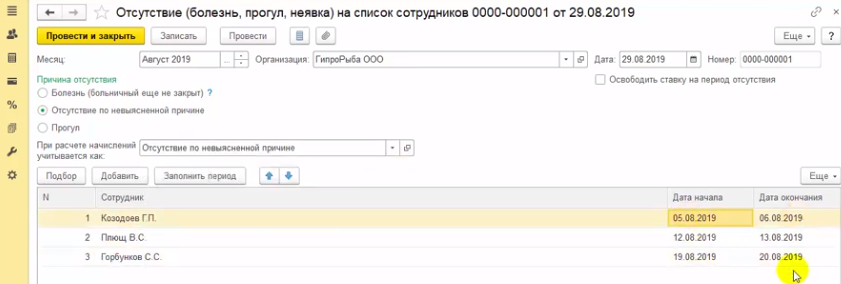 Документ позволяет регистрировать по одной причине отсутствие сразу нескольких сотрудников причем на различные периоды неявки