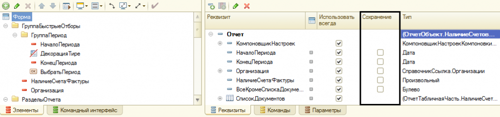 • Восстановление и сохранение в настройках. Для этого нужно зайти в список реквизитов и напротив каждого реквизита, который нужно сохранить ставим галочку в соответствующей колонке.