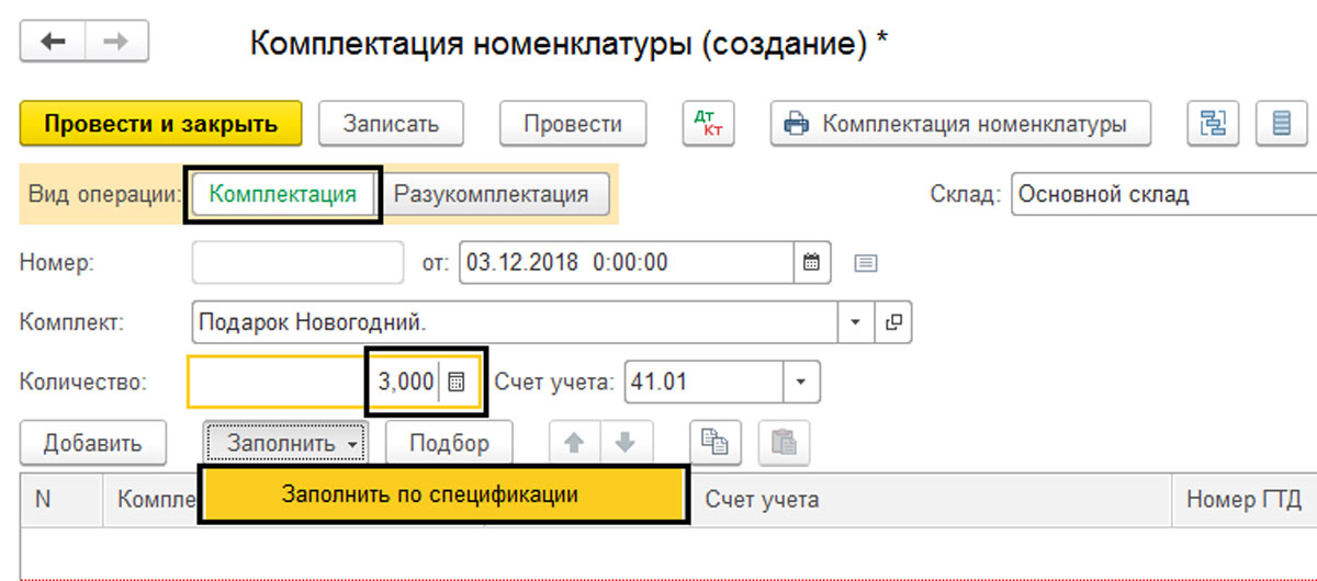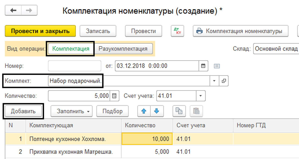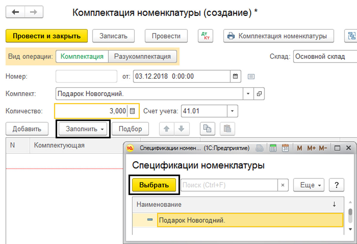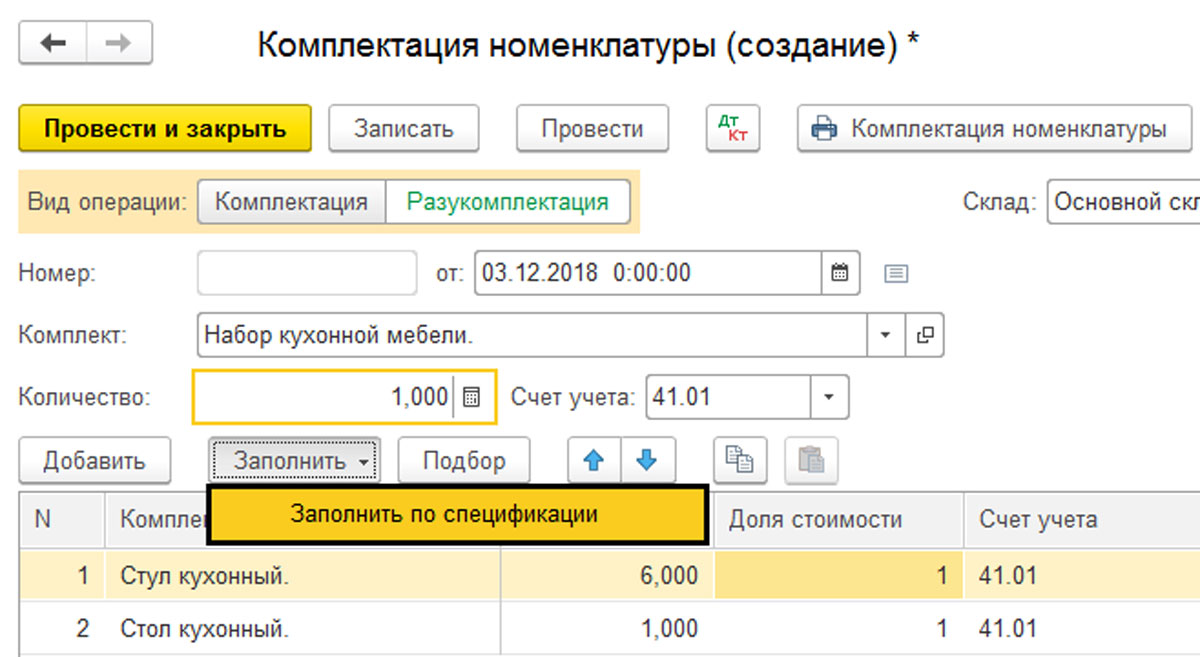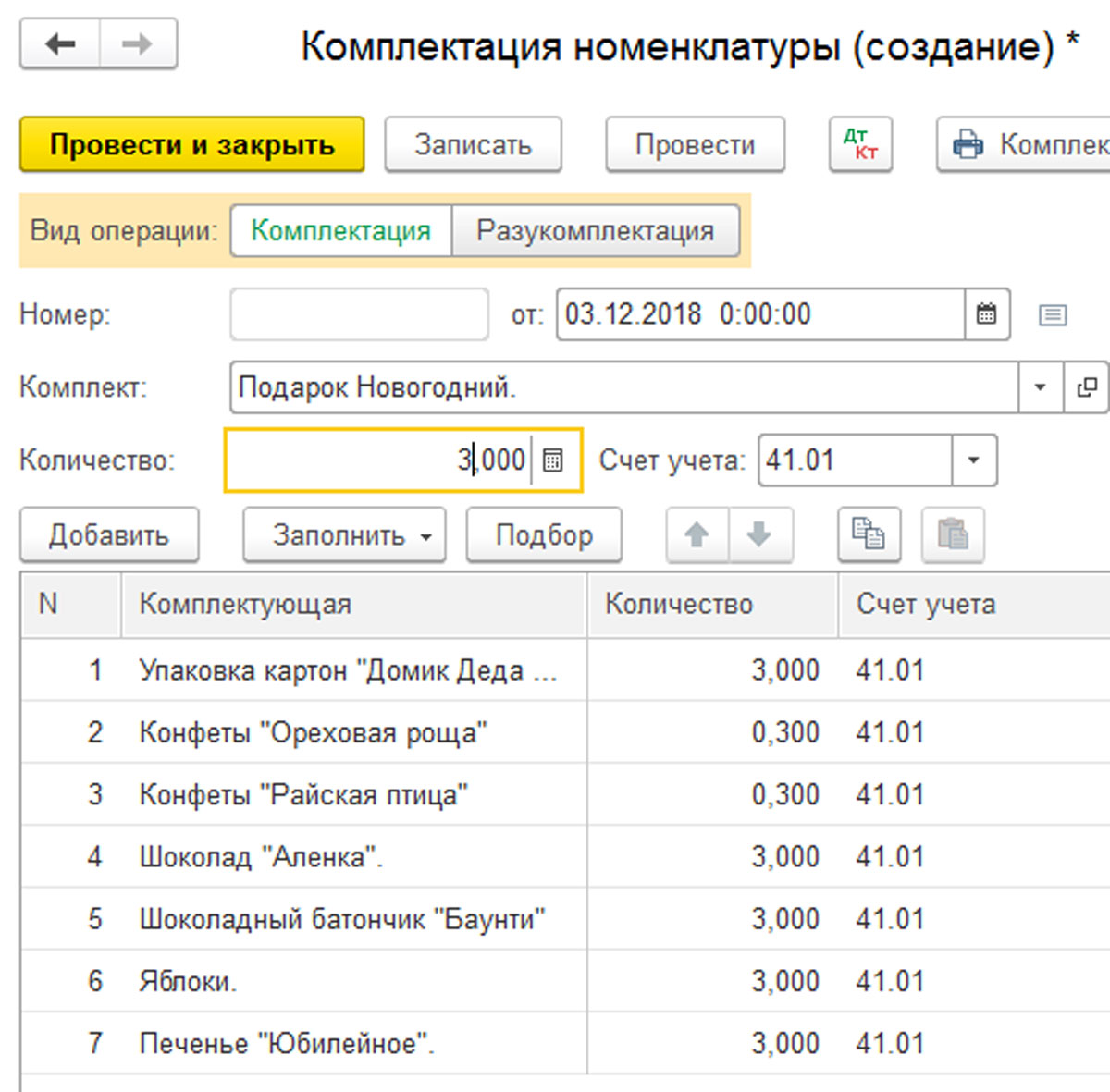 Комплектация номенклатуры в 1С 8.3: пример заполнения