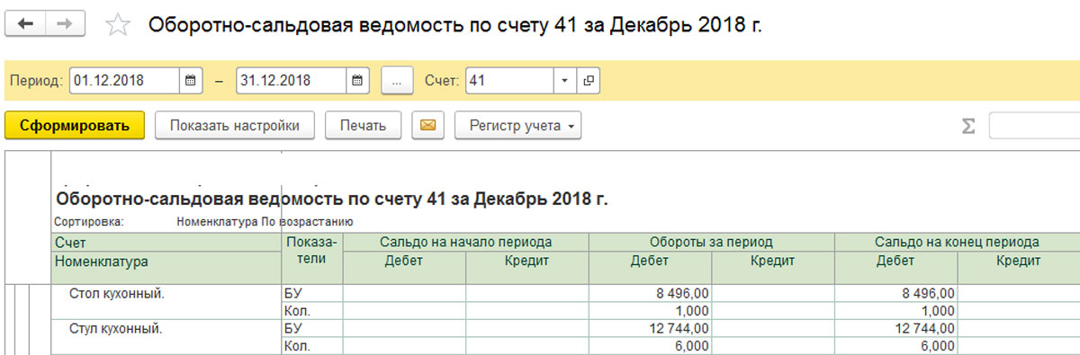 Повторно сформируем "Оборотно-сальдовую ведомость по счету 41-Товары". Стоимость товаров поменяет свое значение (стол приобрёл цену 8496 рублей, а стулья все вместе - 12744 рубля).