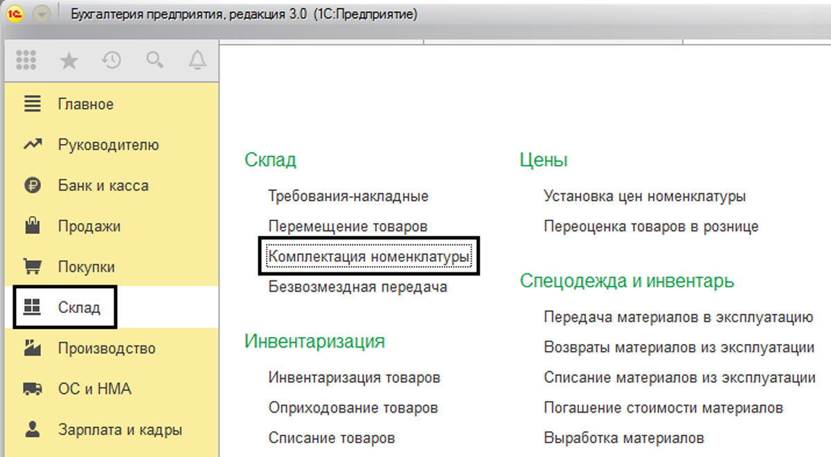 Документ 1С 8.3 "Комплектация номенклатуры" можно найти в меню "Склад".