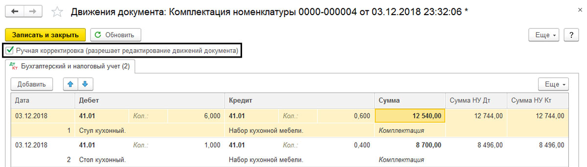 Не всегда с коэффициентом проще указать стоимость. Когда мы самостоятельно хотим назначить цену на позиции, можно прибегнуть к её ручной корректировке. Допустим, что стол из нашего мебельного набора будет стоить 8700 рублей, а каждый стул - 2090 рублей. Подсчитываем стоимость всех стульев и получаем 12540 рублей. В документе уже сформировано движение, открываем его и устанавливаем галочку напротив пункта "Ручная корректировка", после чего заносим изменения. Щелкаем на пункт «Записать и закрыть».