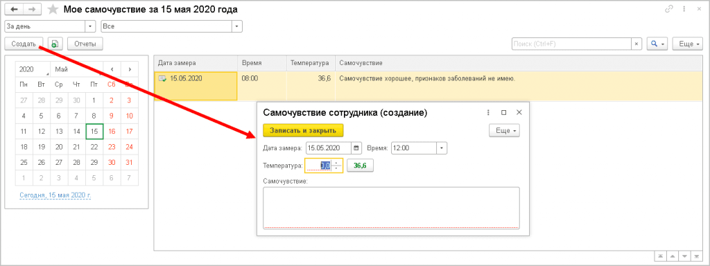 - Кликнуть на кнопку Создать. Если температура тела соответствует норме, кликнуть на клавишу 36,6. Система передаст информацию автоматически.