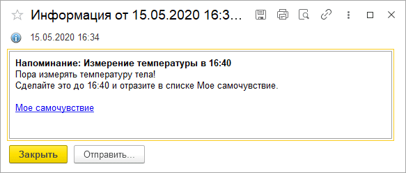 Работник будет получать уведомление о необходимости измерить температуру за 10 мин. до начала процедуры по графику. Из сообщения можно перейти к внесению данных.
