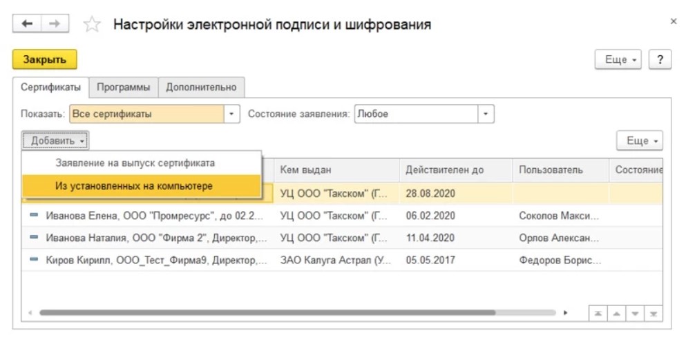В выбранной форме «Настройки ЭП и шифрования» нужно добавить сертификат ключа проверки ЭП, причем, лучше предварительно до этого установить данный сертификат вместе с криптопровайдером. У программы есть возможность оформления заявления на выпуск сертификата, для чего пользователю нужно нажать на кнопку «Добавить».