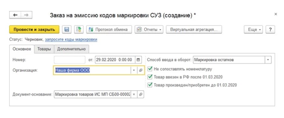 Чтобы понять, нужны ли новые марки, нужно проверить предыдущий заказ – после него могли остаться лишние марки. Тогда их можно наносить на упаковку. При недостатке в этикетках, нужно создать заказ на нужное количество. В созданном файле на эмиссию кодов маркировки, нужно определить способ ввода в оборот.