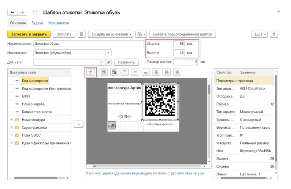 Пользователю нужно настроить шаблон этикетки и тип номенклатуры в зависимости от того, про какую категорию обуви идет речь.