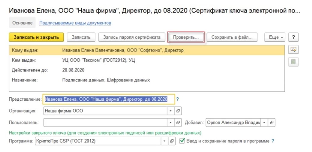Результатом выполненных действий будет формирование карточки, где пользователь может проверить правильность инсталляции сертификата, выбрать нужные для заверки электронные документы и сделать другие действия. Поле «Пользователь» нужно оставить без изменений.