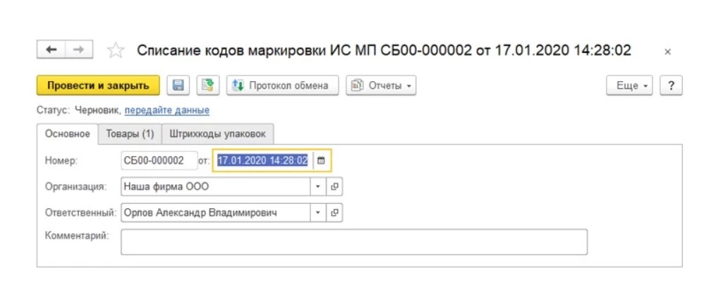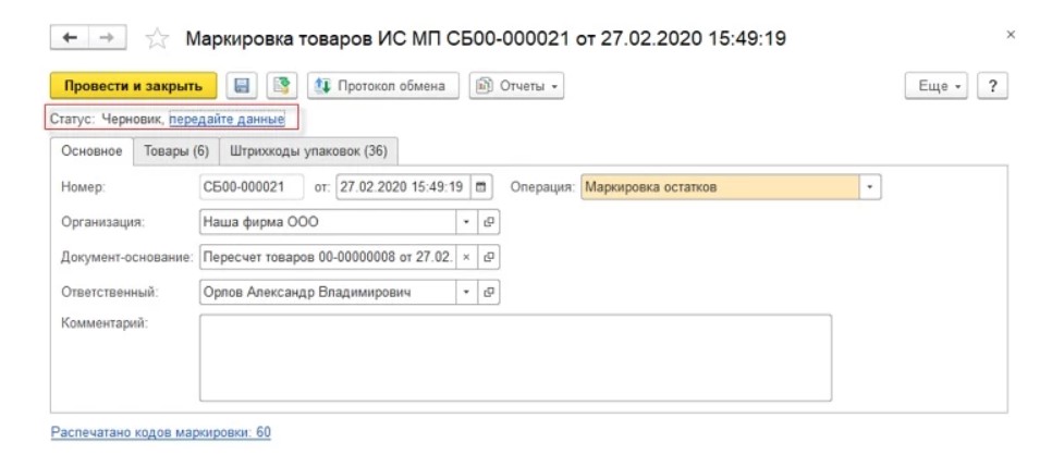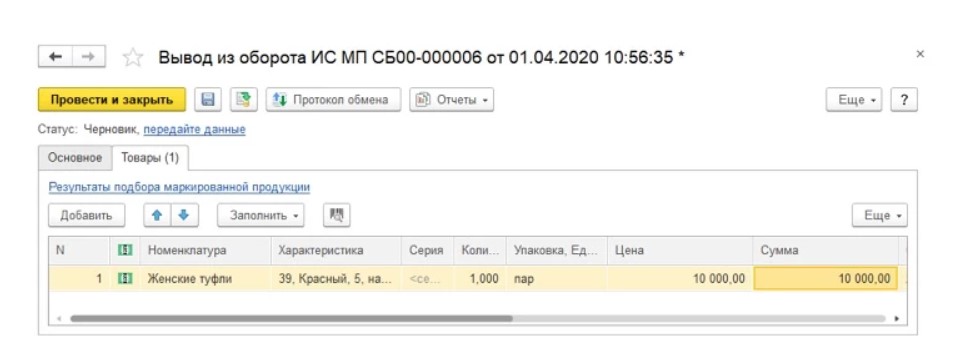 Далее нужно нажать «Провести и закрыть», а потом в разделе «Обмен с ИС МП» нажать строку с названием «Маркировка товаров ИС МП».