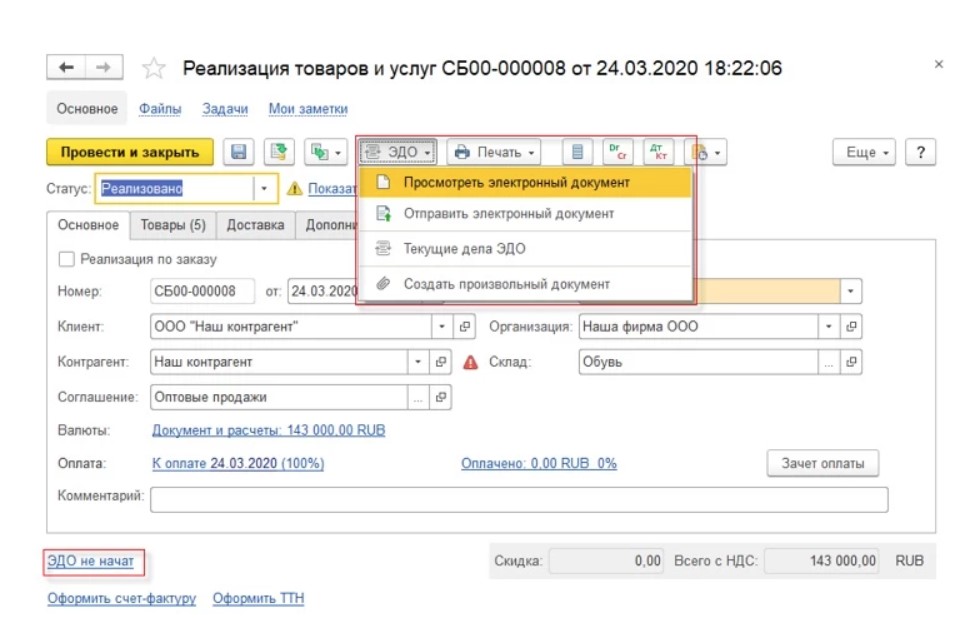 После нажатия «Провести и закрыть» статус будет изменен на «Реализовано». Теперь нужно нажать на «ЭДО» и выбрать «Отправить электронный документ».