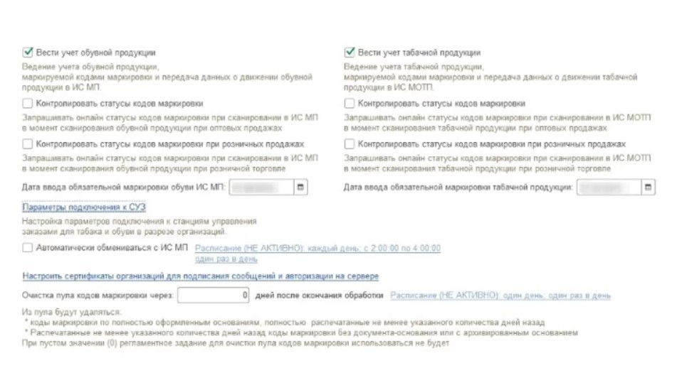 Очень важно указать дату, после которой любое движение внесенных в базу товаров не будет выполняться без присвоенных средств идентификации. По желанию пользователя можно поставить отметки возле пунктов, которые позволят проверять статусы кодов после выполнения операций. Программа имеет функцию обмена с системой прослеживаемости по расписанию, в автоматическом режиме.