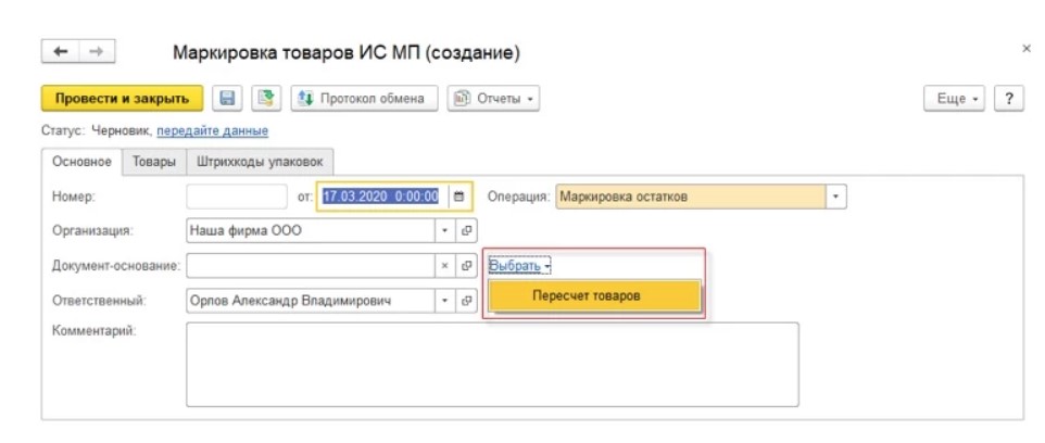 При покупке обуви у российских производителей, нужные метки нужно поставить до 1 сентября, а для обуви, купленной у иностранных производителей, выделяется срока до 1 августа. Определить точное количество заказываемых кодов следует заранее, для чего предварительно выполняется проверка остатков товара. Для инвентаризации остатков обуви в «1С УТ 11» и последующей маркировке, нужно создать документ с названием «Пересчет товаров».