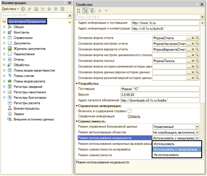 Затем, в обязательном порядке потребуется сохранить произведенные в конфигурации изменения, после чего и обновить их. Та ошибка, о которой шла речь ранее, возникает, если установлена отметка о недопустимости использования режима модальности. Эта возможность возникла, начиная с платформы версии 8.3.3.721, релиз которой состоялся еще в сентябре 2013-го года. Другими словами, те пользователи системы, которые до настоящего момента по каким-либо причинам все еще продолжают работать с более старыми версиями платформы, могут не отказываться от использования модальности. Что же касается других версий, что бы устранить всякую возможность появления окна с ошибкой, допускается простая установка посредством использования вкладки «Использовать».