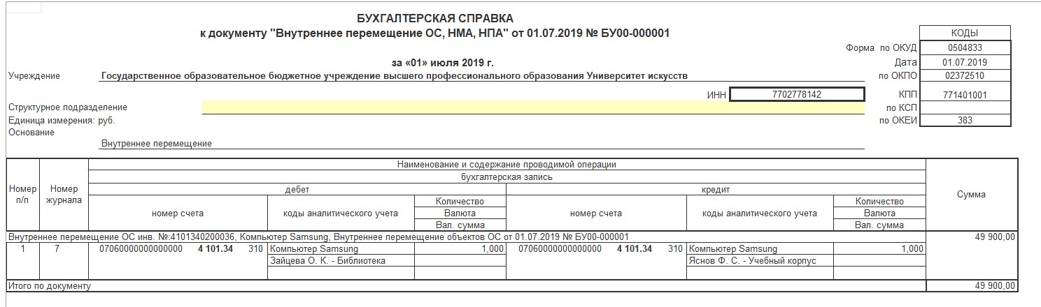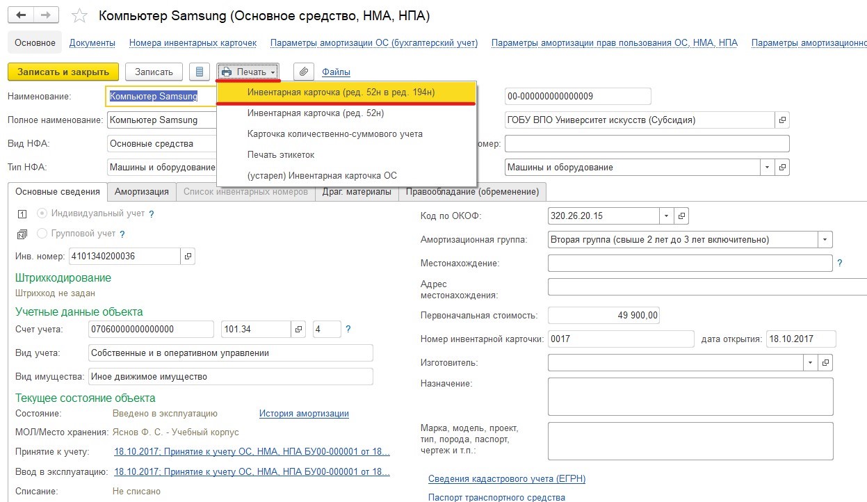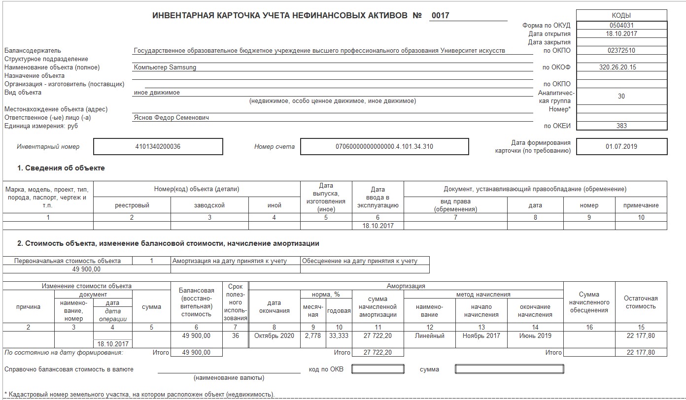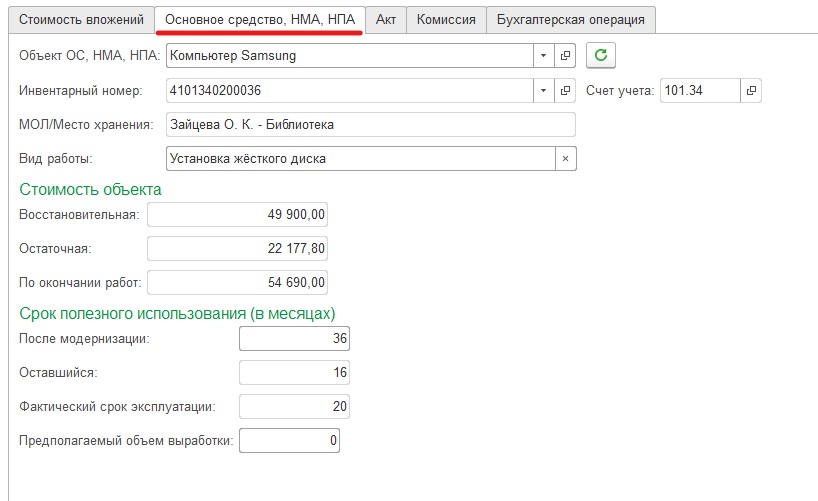 После выполнения всех вышеуказанных действия в инвентарной карточке будет отображена вся новая информация.