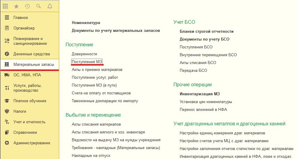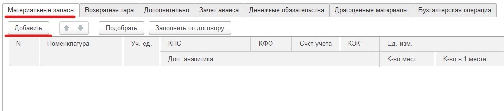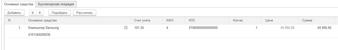 В "Материальных запасах" добавляется номенклатура и выбираются счет для бухгалтерского учета и указывается сумма основного средства.