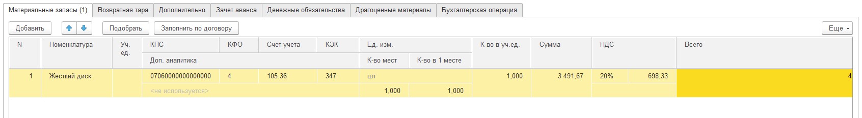 Следующие действия надо отобразить касательно покупки жесткого диска, отображаются они в графе "Поступление МЗ".