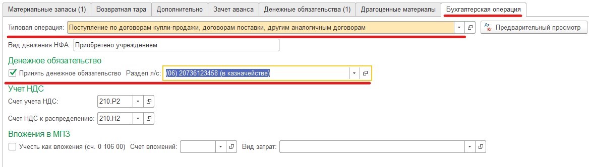 Указывается вид поступления. "Поступления от поставщика". В этой графе указывается дата приобретения, счет взаиморасчетов с КПС. В графе "Отправитель" указывается поставщик и номер договора, который заключили при покупке. В графе "Получатель" - материально ответственный центр.