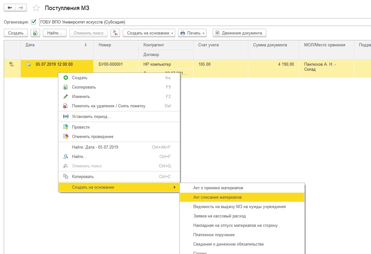 Акт списания достаточно удобно создавать опираясь на поступления МЗ.