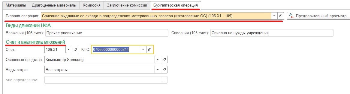 В разделе "Бухгалтерские операции" отображают операцию "Вложение в основные средства". Указывается лицевой счет для выполнения финансовый операций.