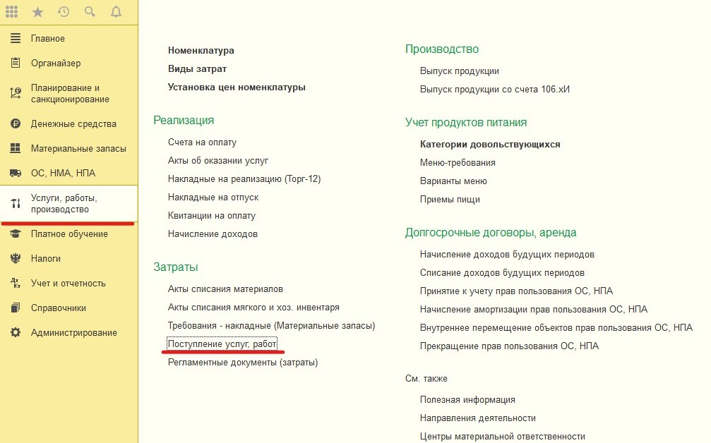 Так как услугу по установке жесткого диска производит поставщик, который не имеет отношения к поставщику, который продавал организации компьютер, нужно отобразить этот факт в разделе "Поступление услуг и работ".