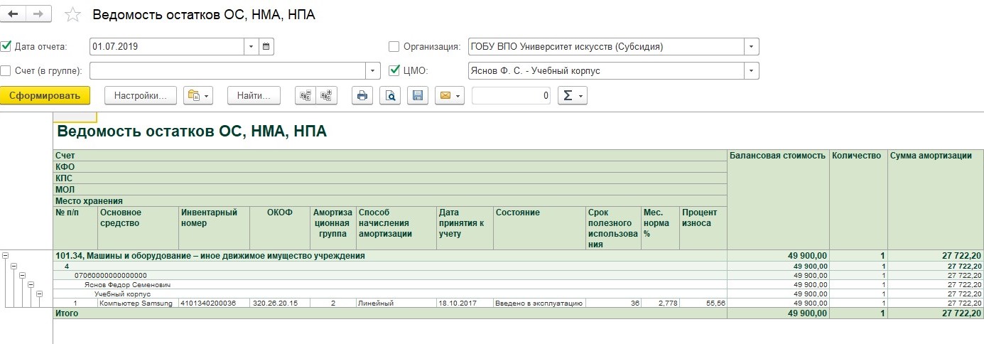 Формируется отчет "Ведомость остатков основных средств", из него видно, что компьютер поставили на учет в октябре 2017 г. и его стоимость 49900 руб., амортизация производилась линейным образом и остаточная стоимость на 1 июля 2019 г. 22177 руб. 80 коп.