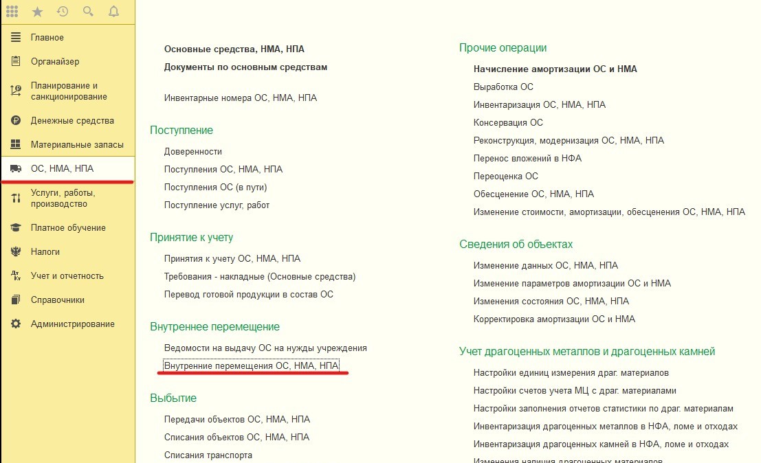 Для того, чтобы отобразить перемещение компьютера из одного подразделения в другое, надо открыть "Внутреннее перемещение ОС".