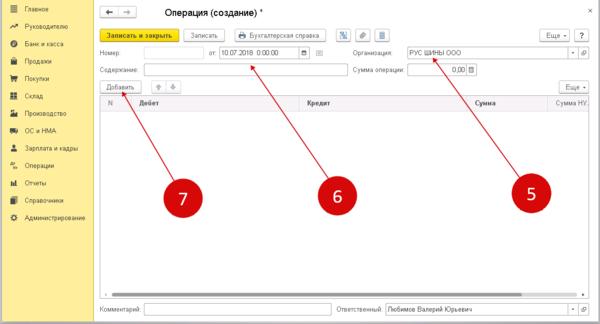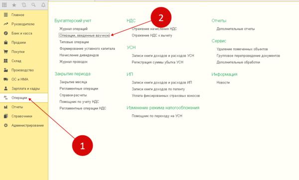Шаг 1. Необходимо создать новую ручную операцию в версии программы 1С 8.3. Пользователь переходит. В раздел «Операции» и кликает на надпись «Операции, введенные вручную». Через несколько секунд пользователю откроется окно для ручных операций.