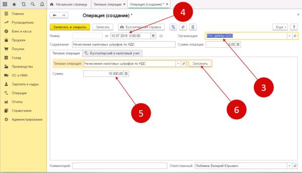 - в пункте «Содержание» указываются такие сведения, как наименование типовой операции (примером услуги становится «Начисление налоговых штрафов по НДС»);