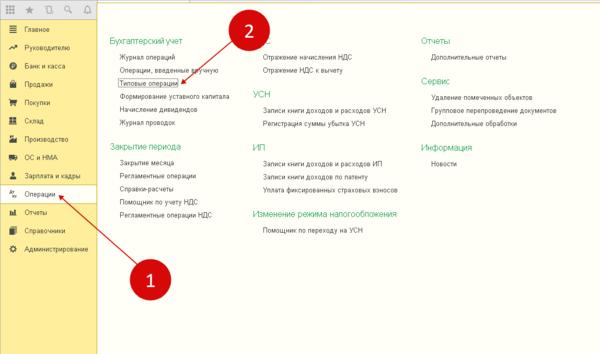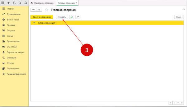 В окне «Типовые операции» стоит выбрать функцию «Создать». В новой вкладке станет доступна форма для открытия операции.