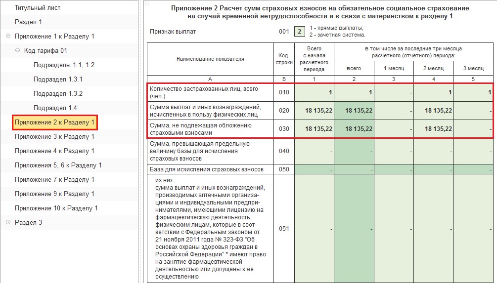 Чтобы проверить корректность отражения начислений и выплат, формируется документ «Расчёт по страховым взносам». В пункте меню «Отчёты» открывается подраздел «Регламентированная отчётность» и выбирается нужная форма. Начисленные суммы должны появиться в Приложении 2 Раздела 1.