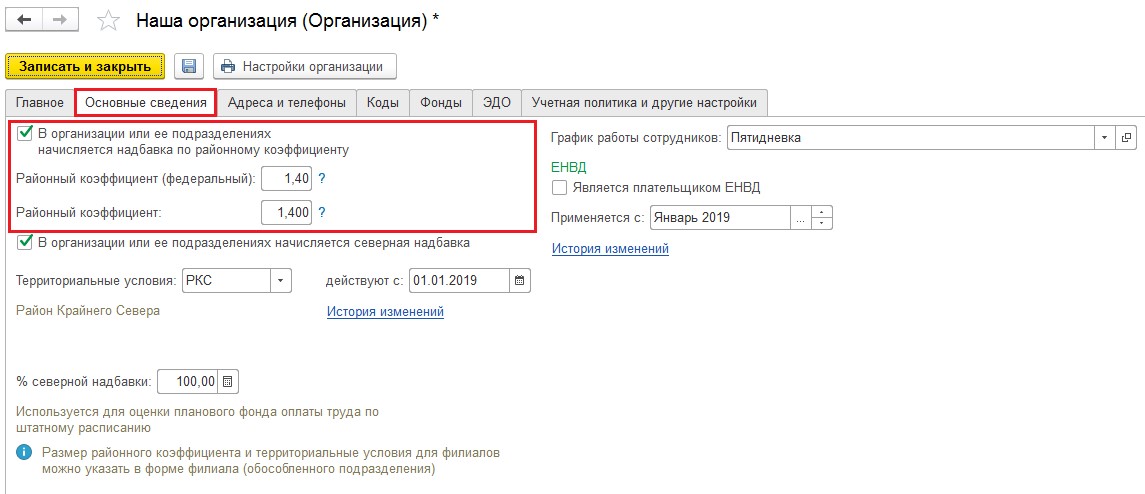 В разделе «Настройка» модуля 1С: ЗУП открывается справочник «Организации». Для компании, действующей в местности с районными коэффициентами, заполняются выделенные поля на закладке «Основные сведения».