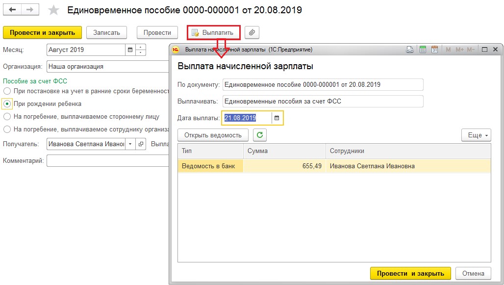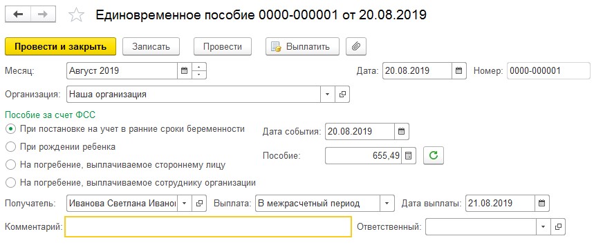 После выбора вида пособия итоговая сумма заполняется в автоматическом режиме. Бухгалтер выбирает дату выплаты и проводит документ.