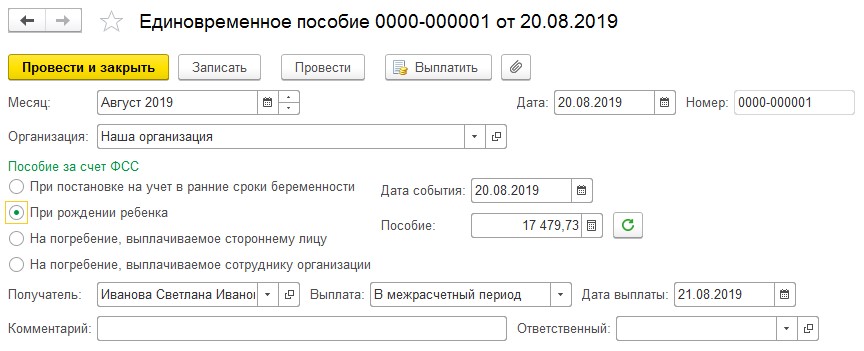 Единовременные пособия: начисления в 1С: Зарплата и управление персоналом