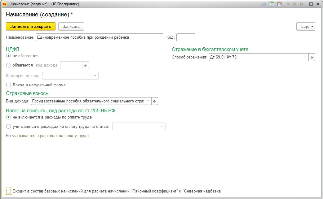 При заполнении графы «Вид дохода» выбирается категория «Государственные пособия обязательного социального страхования, выплачиваемые за счёт ФСС». Следует указать, что выплата не относится к расходам на оплату труда. Отметки «Входит в состав начислений для расчёта «Районный коэффициент», «Северная надбавка» снимаются.