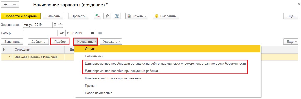 Как начисляются пособия? Через раздел меню «Зарплата» выбирается подраздел «Все начисления» и создается новый документ «Начисление зарплаты». Необходимо указать период. Затем, через опцию «Подбор», добавляется ФИО сотрудницы. Нажимается кнопка «Начислить», выбирается соответствующая категория дотации из выпадающего списка, вводится сумма.
