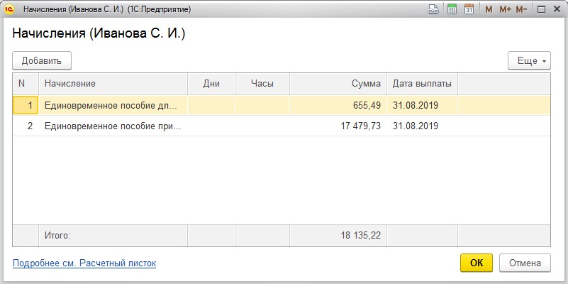 В 1С: Бухгалтерии реализовано начисление обоих видов пособий одним документом. После заполнения значений, соответствующих первой выплате, еще раз нажимается кнопка «Начислить» и заполняются поля по второй категории. Если навести курсор на значения графы «Сумма», можно получить расшифровку начислений.