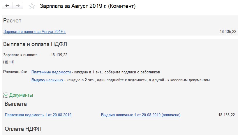 Для оформления выплаты следует, как и в 1С: ЗУП, нажать кнопку «Выплатить» вверху документа. Платежная ведомость создается в автоматическом режиме. Одновременно формируются «Выдача наличных», «Платёжное поручение».
