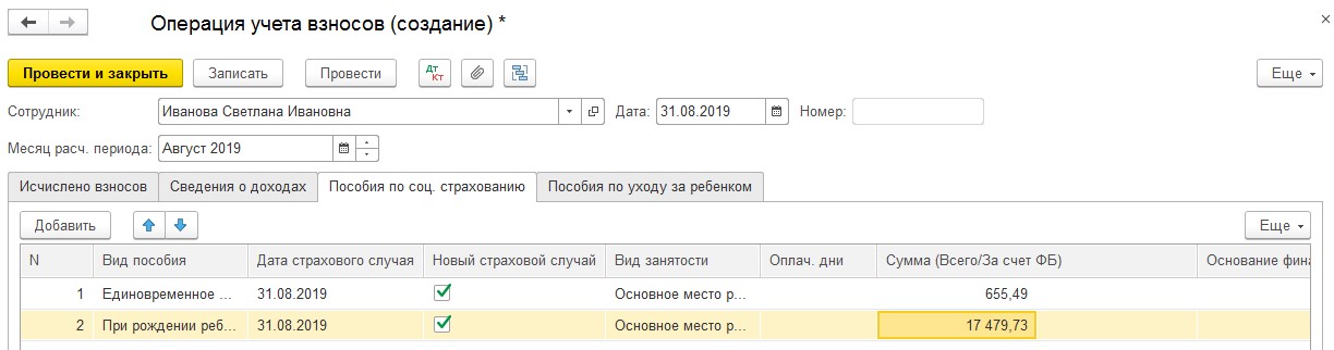 Заполняется одна из вкладок – «Пособия по соц. страхованию». После добавления новой строки выбирается вид начисленной дотации. Вводятся значения в графы, относящиеся к датам страховых случаев, видам занятости, суммам начислений. Отмечается галочкой пункт «Новый страховой случай». Готовый документ проводится и закрывается.