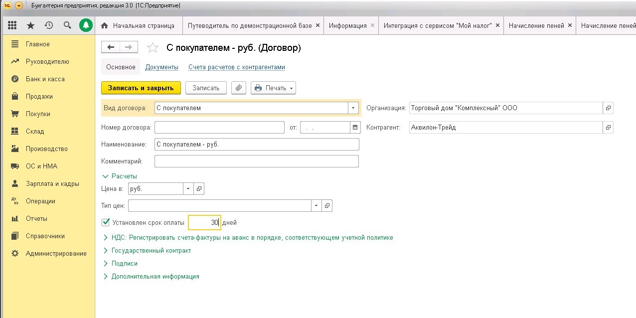 В нашем примере есть галочка и срок оплаты в договоре с клиентом.
