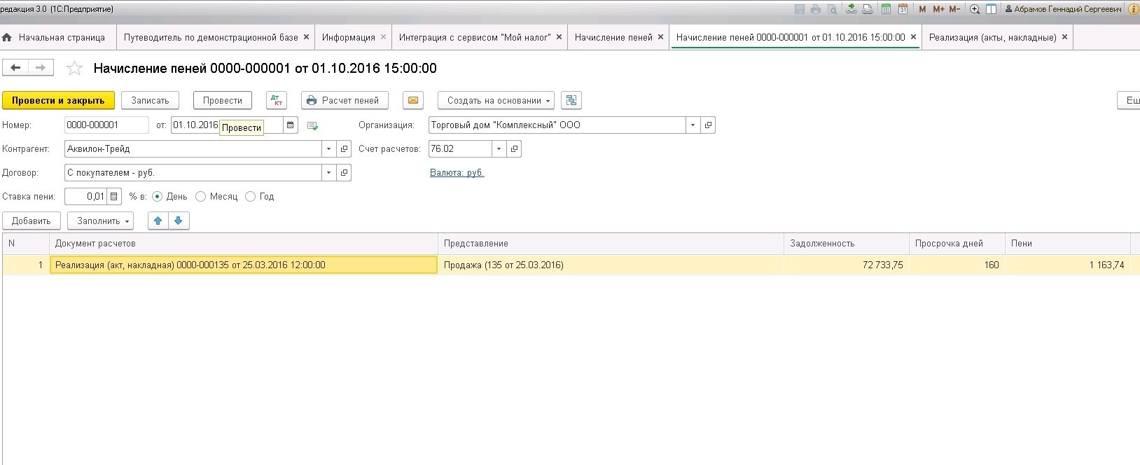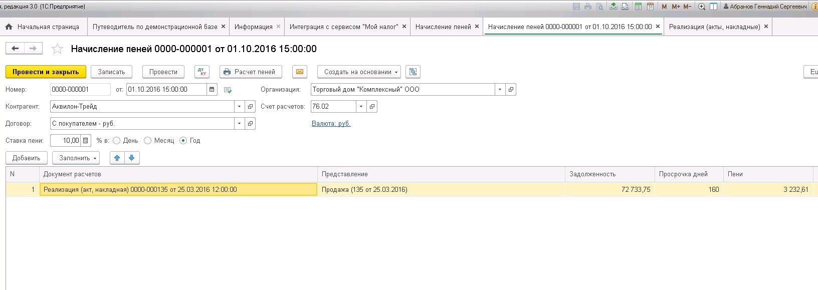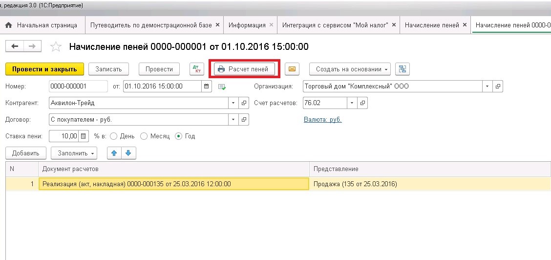 После уточнения в шапке документа ставки, то сумма автоматом высчитывается в столбце «Пени».