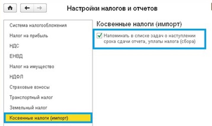 Декларацию по косвенным налогам можно заполнить в 1С: Бухгалтерия при использовании списка задач. Чтобы такая возможность была, нужно в "Настройке списка налогов и отчетов" перейти в подраздел с отчетностью по косвенным налогам и поставить флажок для напоминания о сроках сдачи расчета.