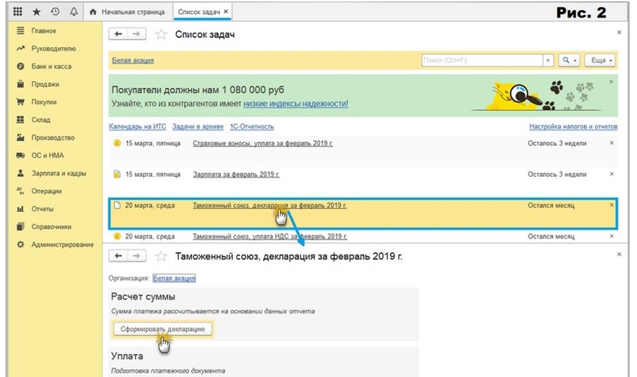 Далее для заполнения декларации нужно из списка задач перейти по гиперссылке "Таможенный союз" и нажать "Сформировать декларацию".