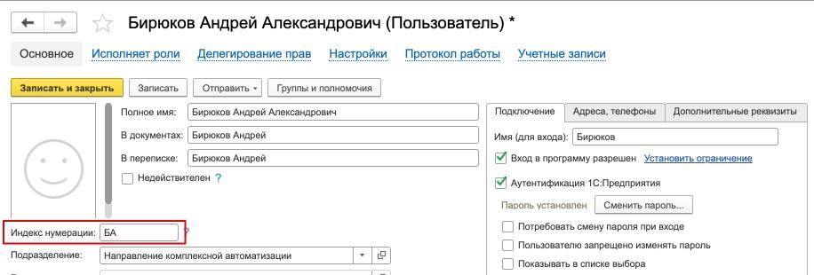 • "Индекс подразделения" - так же состоит максимум из 10 символов и отображает краткое наименование подразделения, которое настраивается в карточке подразделения