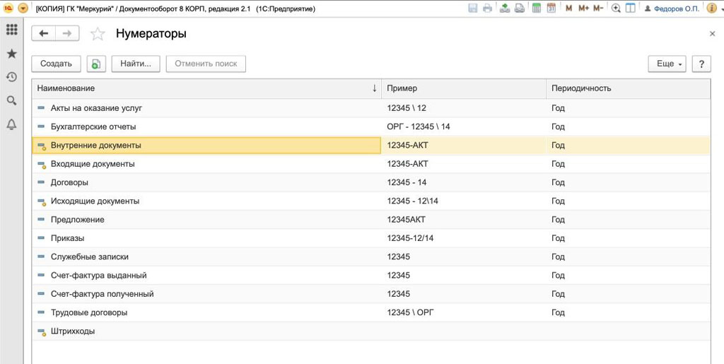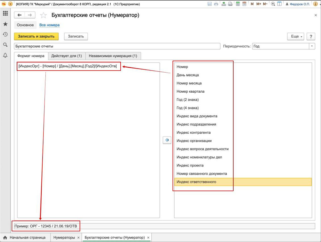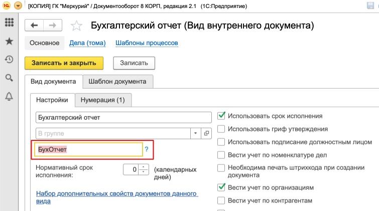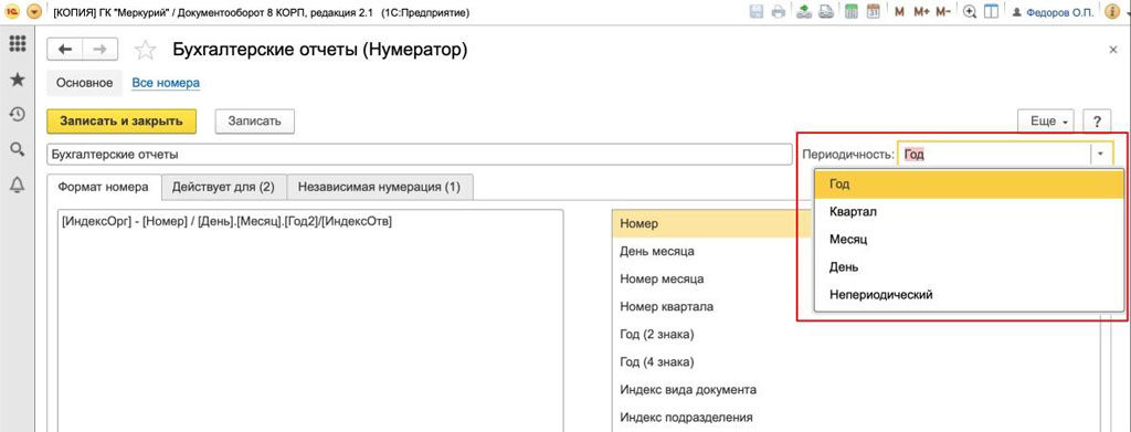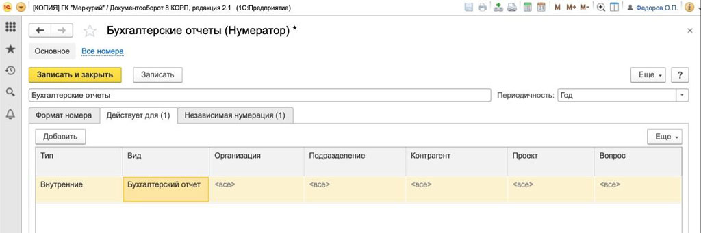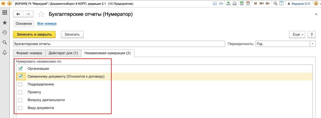 Параметры нумерации и их настройка для документов в программе 1С Документооборот.