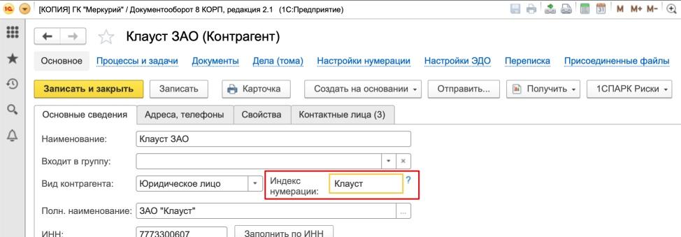 • "Индекс организации" - 10 символов максимум, отображает в основном краткое название организации, к которой относится документ, настраивается в карточке организации.