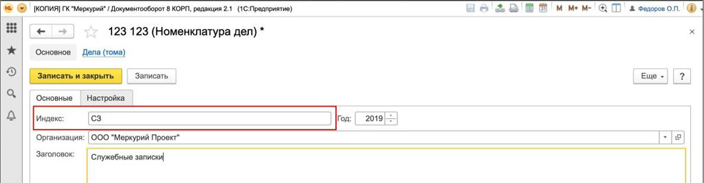 • "Индекс номенклатуры дел" - максимум 10 символов, показывает краткое название конкретной номенклатуры дел, настраивается в карточке данного элемента.