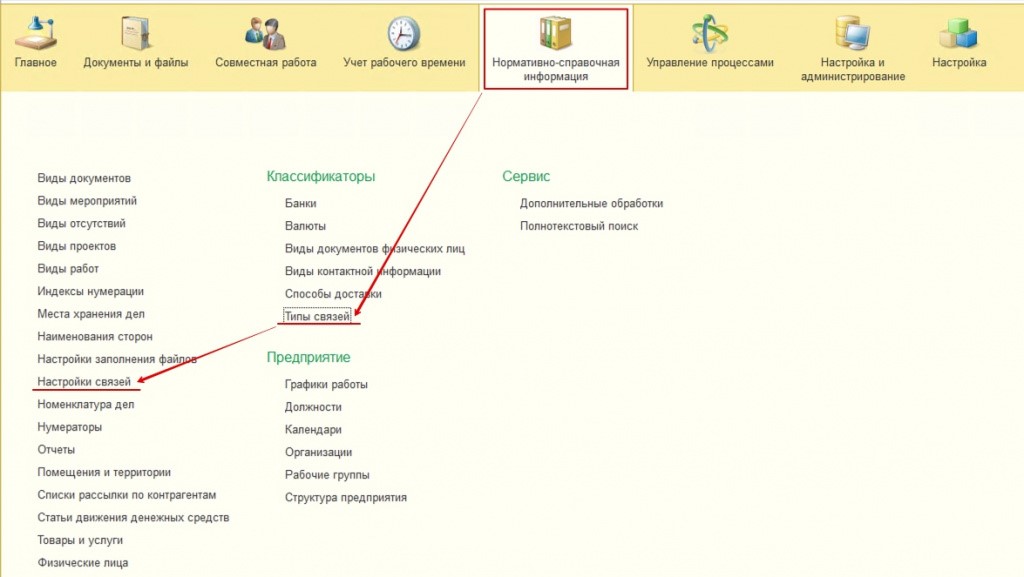 Для того, чтобы настроить связь документов, вам понадобится справочник под названием «Типы связей». Найти его можно в подразделе «Нормативно-справочка информация». Также вам понадобится регистр сведений. Перейти в него вы сможете из этого же подраздела и называется он «Настройка связей». Дополнительно можно перейти в него из элемента «Типы связей».