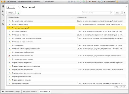 Все виды связей, которые мы обозначили есть в 1С: Документооборот и используются во время настройки системы.